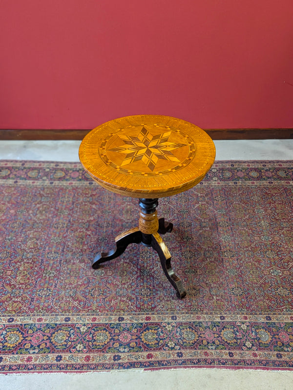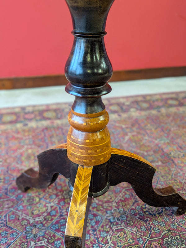 A remarkable Victorian walnut circular Sorrento table with exceptional inlaid decoration to the tabletop, raised on a thick turned ebonised pedestal terminating in three finely shaped outswept inlaid legs.