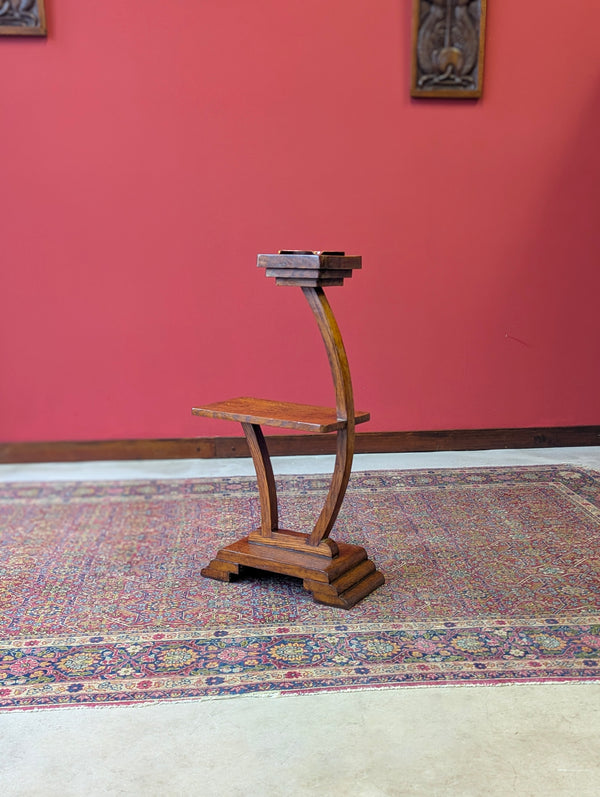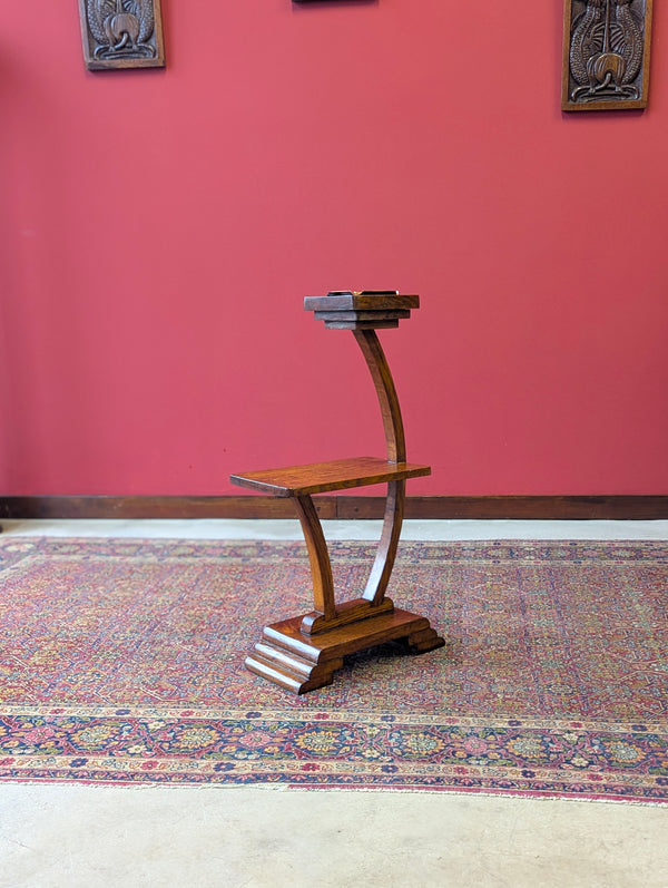 A wonderfully characterful 1920’s Art Deco smokers companion table. Features a removable copper ashtray to the top above a lower tier table, all raised on an attractive stepped base.
