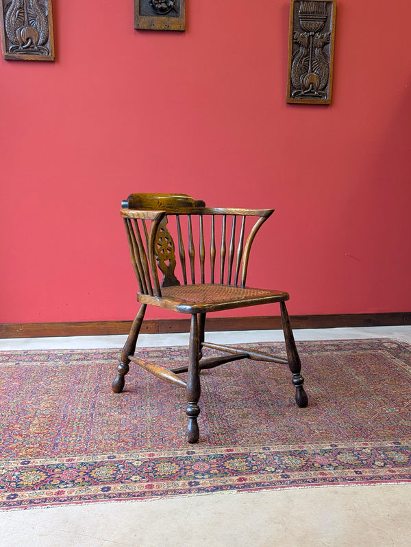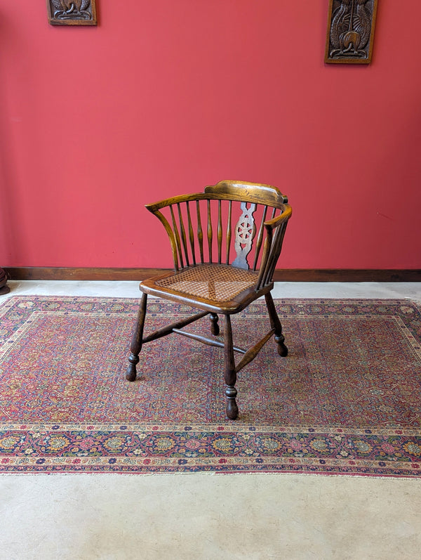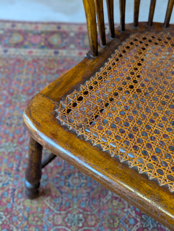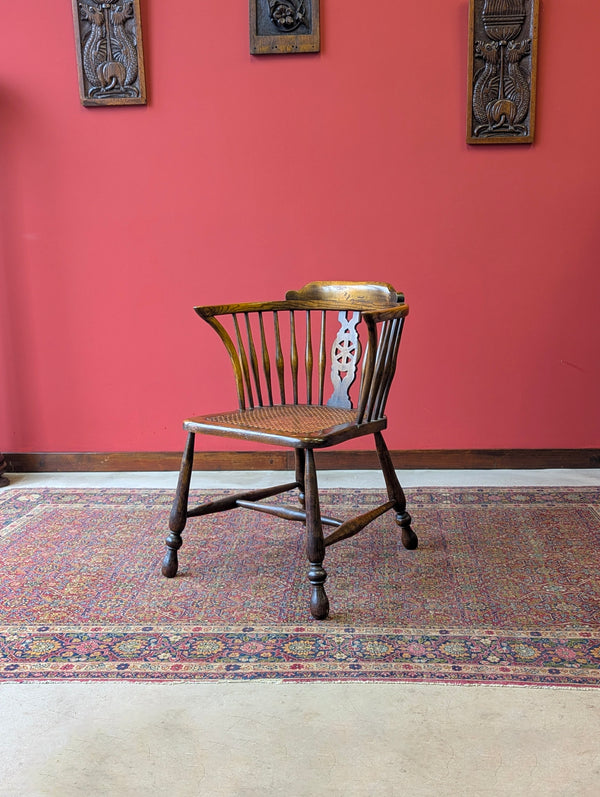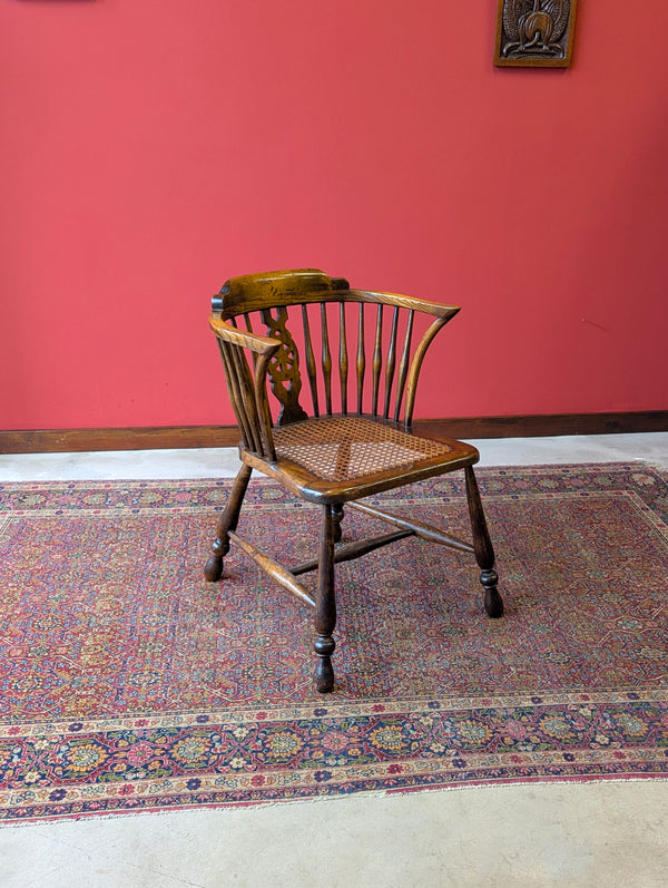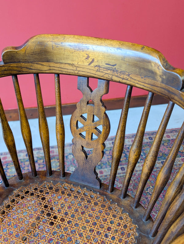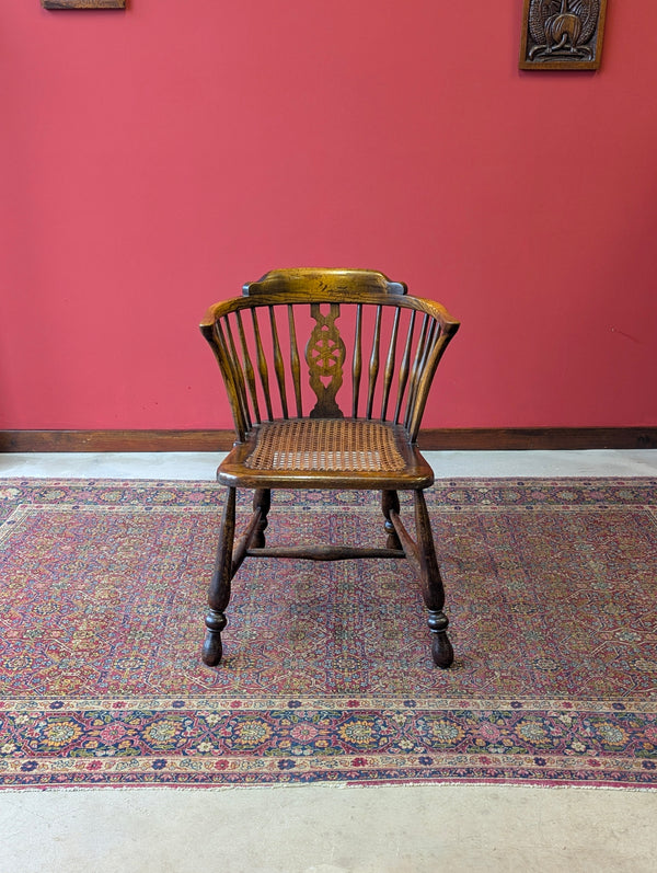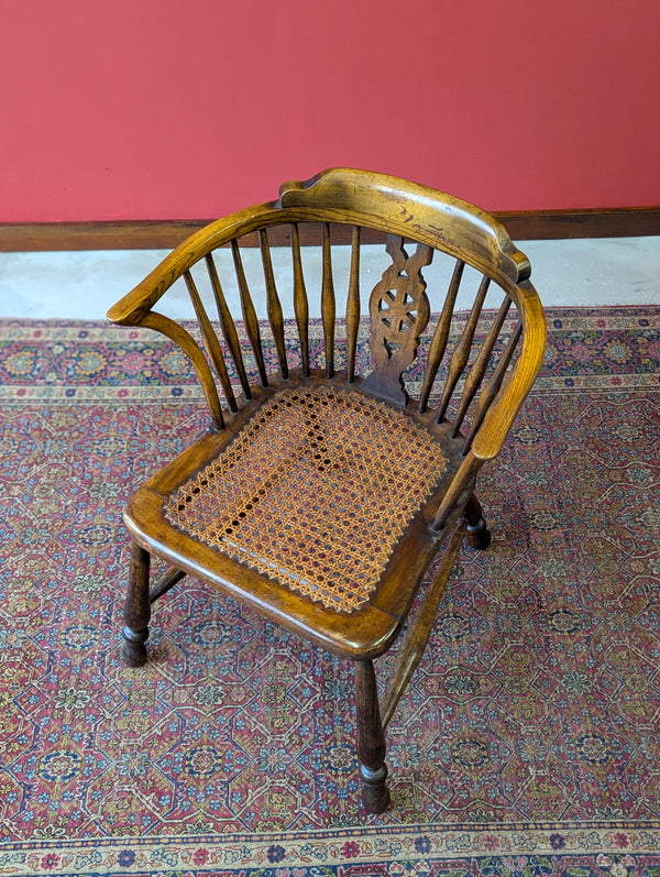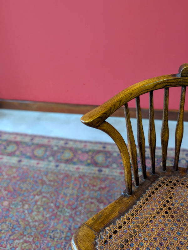 A quality Edwardian oak low back windsor chair / elbow chair by esteemed makers Robertson & Colman of Norwich. Pleasing diminutive form and shape with a curved spindle back over the original cane seat in excellent condition, raised on splayed turned legs united by a H stretcher.