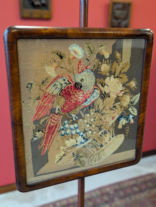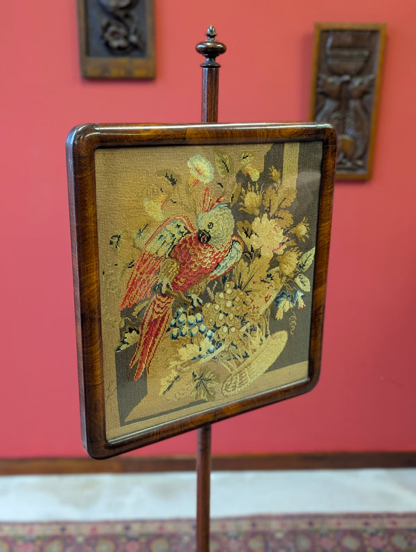 A Regency period pole screen dating to the early 19th century featuring a particularly characterful framed adjustable tapestry of a parrot atop a floral basket, secured on a beautifully turned bulbous pole terminating in a finely shaped base raised on turned bun feet.
