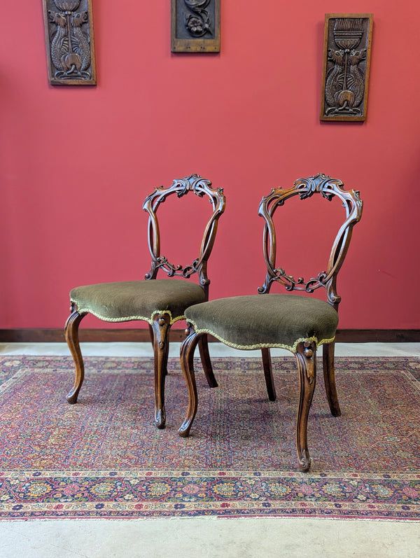 The pierced frames are crisply carved with scrolling acanthus and foliate motifs, showcasing the quality of the walnut and the craftsmanship of the period. The front legs are similarly well drawn, with shapely lines and sharp detailing. Each seat is traditionally upholstered in a moss green fabric with a decorative braid trim.